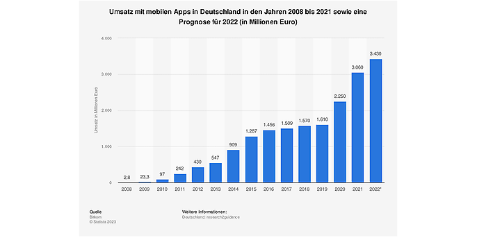 Prognose zum Umsatz mit mobilen Apps, Quelle: Statista https://de.statista.com/statistik/daten/studie/173810/umfrage/umsatz-mit-mobilen-apps-in-deutschland-seit-2009/