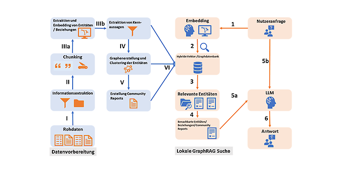 Lokale Anfragen werden genutzt, um spezifischere Anfragen an die eigenen Daten zu richten. Das Vorgehen entspricht hierbei zunächst dem klassischen RAG-Prozess: Die Anfrage wird zunächst