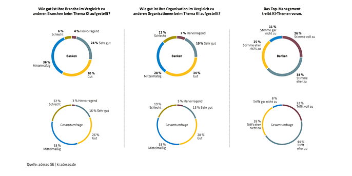 Wir haben Verantwortliche in deutschen Banken befragt, wie sie den Stand, die Herausforderungen und die Vorteile beim Einsatz von Künstlicher Intelligenz (KI) sehen. Die Verantwortlichen bewerten die Situation ihrer Branche und ihres Unternehmens durchaus wohlwollend. Ein Beispiel dafür: