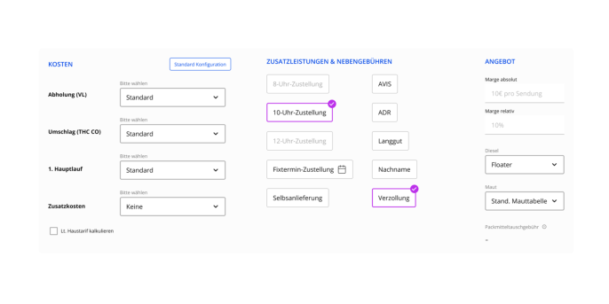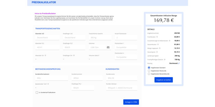 Darüber hinaus entwickeln wir Strukturen, die Ihnen Klarheit über Roherträge im Bestandsgeschäft verschaffen und Nachkalkulationen für Preisänderungen erleichtern. Auf Wunsch integrieren wir das System nahtlos in Ihre bestehende IT-Landschaft, etwa über Schnittstellen zu CRM-, TMS- oder anderen relevanten Anwendungen.