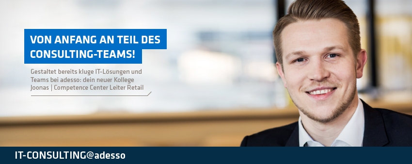Wir gehören zu den Top-Adressen in der IT-Welt und fokussieren uns auf die Optimierung der Kerngeschäftsprozesse unserer Kunden. Unseren Erfolg aber erreichen wir nur durch eins: die Menschen bei adesso! Lassen Sie sich von uns überzeugen. Vermitteln und gestalten - unser IT-Consulting ist das starke Bindeglied zwischen Fachabteilungen und IT. An der Schnittstelle von Theorie und Praxis braucht es kluge Köpfe mit Organisationstalent. Strategisches Denken, Ideen für die Technologie- und Toolauswahl sowie die digitalen Trends vereinen unsere IT-Consultants mit Projektmanagement.