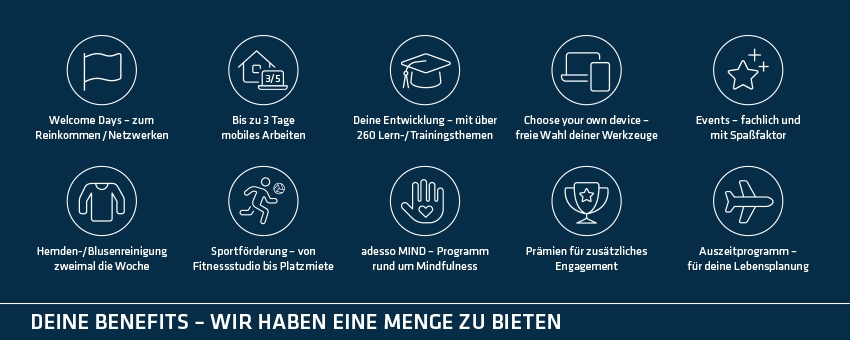 Unser Ziel ist es, dass Sie sich bei uns wohlfühlen. Wir legen großen Wert auf ein kollegiales und von Gemeinschaftsgefühl geprägtes Umfeld. Die familiäre Arbeitsatmosphäre zeichnet sich durch ein besonderes „Wir-Gefühl“ aus – hierfür gibt es sogar ein Wort: „adessi“! Und dafür tun wir auch einiges. Kontinuierlicher Austausch, Teamgeist und ein respektvoller sowie anerkennender Umgang sorgen für ein Arbeitsklima, das verbindet. So belegen wir zum wiederholten Male den 1. Platz beim Wettbewerb „Deutschlands Beste Arbeitgeber in der ITK"! Wir eröffnen Entwicklungs- und Führungsmöglichkeiten – unser Versprechen, ein Chancengeber zu sein, nehmen wir ernst. Unser umfangreiches Schulungs- und Weiterbildungsangebot sorgt dafür, dass Ihre Entwicklung bei uns nicht still steht.