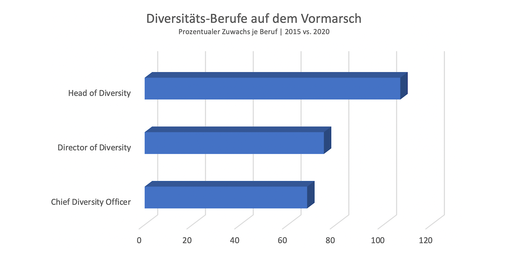 Die aktuellen Bestrebungen vieler Unternehmungen, Inklusion, Diversität und den barrierefreien Zugang zur täglichen Arbeitswelt zu gewährleisten, vermehren sich zunehmend. Berufsgruppen, die sich diesen Themen verpflichtet fühlen, erfuhren bis zum Jahr 2020, im Vergleich zu 2015, ein weltweites Wachstum von teils über 100 Prozent, wie in der Darstellung anhand einer LinkedIn-Data-Auswertung gezeigt: