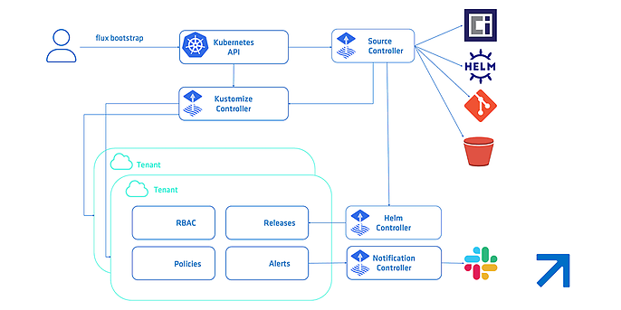 Flux ist eine Open-Source-Continuous-Delivery-Lösung, die explizit für Kubernetes entwickelt wurde. Im Kern stellt Flux sicher, dass der Zustand des Kubernetes-Clusters dauerhaft mit den definierten Konfigurationsquellen synchron bleibt. Hauptsächlich handelt es sich um Git -, OCI- und Helm-Repositories sowie Flux-Kustomizations, aber auch um einfache Kubernetes-Ressourcen. Flux verwaltet und deployt diese Ressourcen und bietet GitOps-Funktionen sowohl für die Infrastrukturkonfiguration als auch für Applikations-Workloads. Dabei nutz Flux das native API-Interface von Kubernetes und integriert sich nahtlos in andere zentrale Komponenten des Ökosystems. So unterstützt es Multi-Tenancy und die Synchronisierung mehrerer Git-Repositories gleichzeitig.
