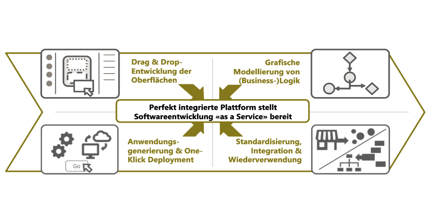 Um diese Ziele zu erreichen, setzt Low-Code die folgenden vier Bausteine ein: