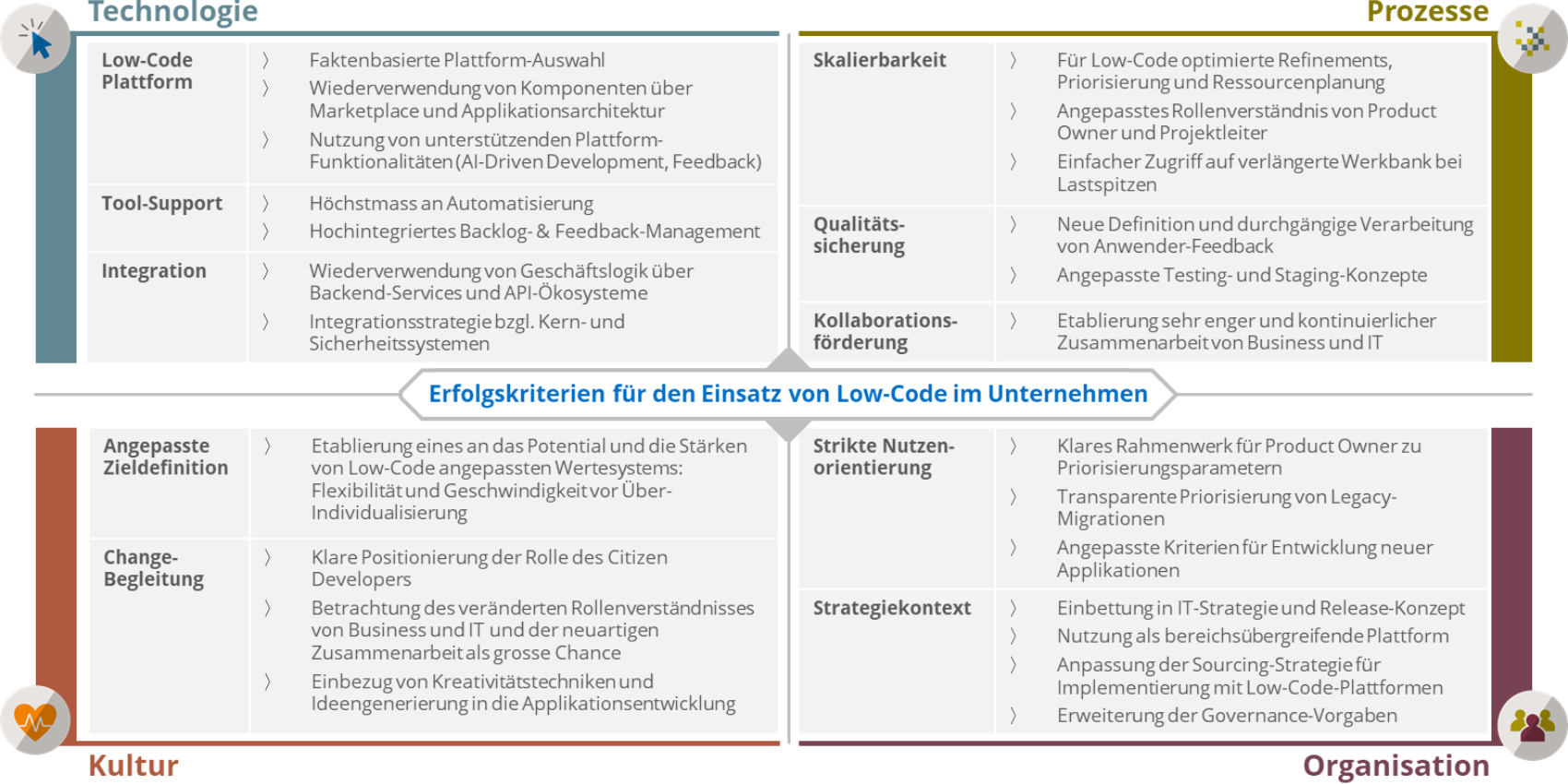 Die Bandbreite der Risiken zeigt, dass die Vorbereitungen und die Einbettung von Low-Code im Unternehmen ganzheitlich betrachtet werden muss. In der folgenden Abbildung werden die vier Bereiche «Technologie», «Prozesse», «Kultur» und «Organisation» sowie die jeweiligen Aspekte zusammengefasst, die in Summe die Erfolgskriterien für den Einsatz von Low-Code im Unternehmen darstellen.