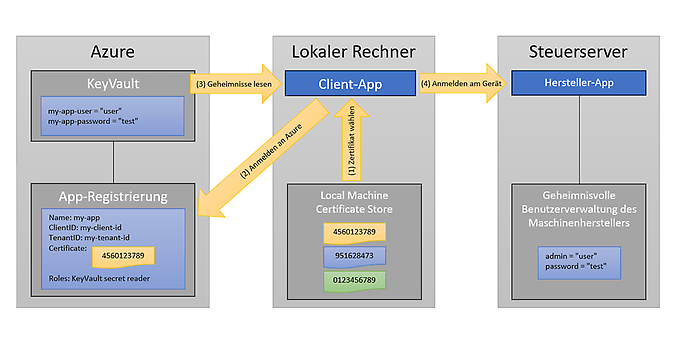 Angenommen, alle beteiligten Dienste laufen in einem beliebigen Rechenzentrum. Der betreffende Webservice, nennen wir ihn Maschinen-Client, hat Zugriff auf Azure im Internet und auf den Maschinen-Server im lokalen Netzwerk. Alle notwendigen Zugangsdaten befinden sich gut geschützt im KeyVault.