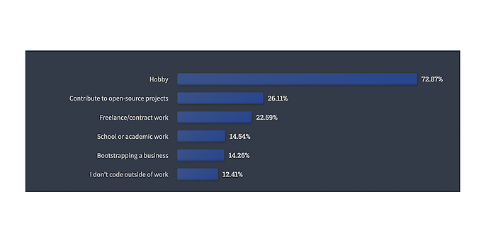 Es ist auch nicht überraschend, dass einige Entwicklerinnen und Entwickler Freelance- oder Contract-Arbeiten in ihrer Freizeit ausüben, da diese flexible Arbeitszeiten und die Möglichkeit bieten, ihre Fähigkeiten zu nutzen und zu monetarisieren. Es ist wichtig zu beachten, dass diese Zahlen nur einen Ausschnitt darstellen und es keine allgemeine Regel dafür gibt, wie Programmiererinnen und Programmierer ihre Freizeit verbringen. Jeder Developer hat seine eigenen Interessen und Ziele.