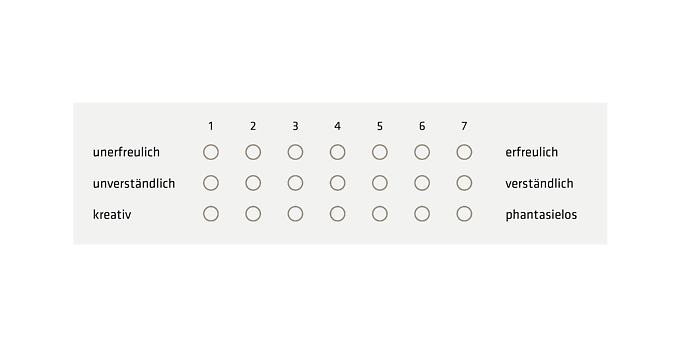 Dieser Fragebogen gibt das subjektive Nutzererlebnis durch 26 gegensätzliche Adjektivpaare wieder, welche auf einer Skala von eins bis sieben in ihrer Ausprägung bewertet werden. Jeder Bewertung wird eine Zahl zwischen -3 und +3 zugeordnet. Aus den Aussagen wird der Mittelwert gezogen und kann wie folgt bewertet werden: