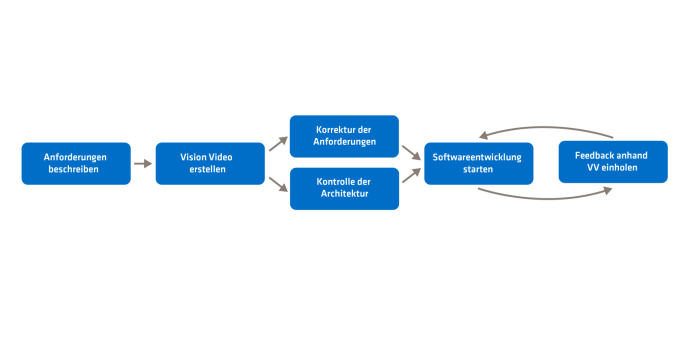 Hierbei sind die einzelnen Schritte des Entwicklungsprozesses in Blau und Beispiele für Vision Videos (VV) in Grün dargestellt. Durch die Abbildung wird verdeutlicht, dass Vision Videos auf Basis einer Beschreibung produziert und anschließend dazu verwendet werden können, den nächsten Schritt des Softwareentwicklungsprozesses zu unterstützen. Zusätzlich können sie als Kontrolle dienen, da anhand der Vision Videos die Ergebnisse des Entwicklungsprozesses überprüft werden können. Als Beispiel hierfür wird aus der anfänglichen Problemstellung ein Problemszenario in einem Vision Video dargestellt. Anhand des Vision Videos können dann zunächst die Anforderungen entwickelt und gegen Ende des Projekts die Funktionen des Systems überprüft werden.