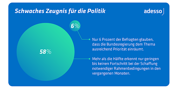 Nur sechs Prozent der Befragten sind der Meinung, dass die Bundesregierung dem Thema Digitale Souveränität die nötige Priorität einräumt. Mehr als die Hälfte (58 Prozent) erkennt in den vergangenen Monaten nur ein geringes oder gar kein Engagement, die notwendigen Rahmenbedingungen zu schaffen. Ebenso wird die öffentliche Diskussion als stagnierend empfunden. Lediglich zwei Prozent der Befragten sehen eine „deutlich positive Veränderung“. Die Wahrnehmung: viel Rhetorik, wenig Umsetzung.