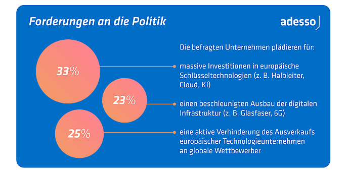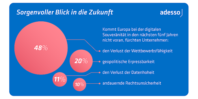Dabei erkennen die Unternehmen großen Handlungsdruck. So sieht nahezu die Hälfte der Befragten (48 Prozent) die Wettbewerbsfähigkeit des eigenen Unternehmens bei mangelnder digitaler Souveränität in Gefahr. Geopolitische Erpressbarkeit ist derweil für jeden fünften Befragten (20 Prozent) die größte Sorge. Jeweils jeder Zehnte befürchtet den Verlust der Datenhoheit und eine permanente Rechtsunsicherheit.