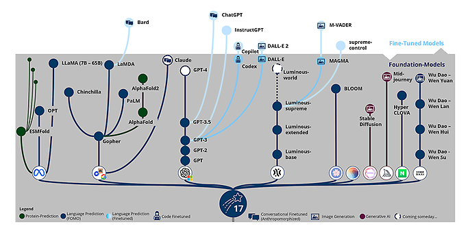 Apart from those models, there are other really interesting variants, such as models that have been trained on the basis of protein sequences and can thus predict protein structures. These include ESMFold from MetaAI and AlphaFold from Deepmind/Alphabet. Then there are models that are primarily concerned with generating images – including Midjourney and Stable Diffusion.