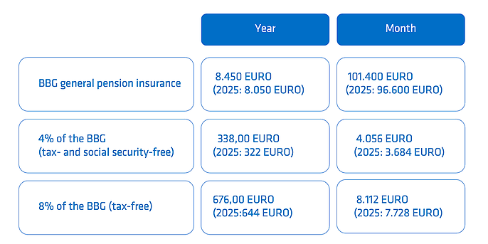 On 9 September 2025, the Federal Ministry of Labour and Social Affairs published the draft bill for the Social Security Calculation Parameters Regulation 2026. This provides for an increase in the BBG. Following consultation in the Federal Cabinet, where no significant changes are expected, the Federal Council still has to give its approval. Experience shows that this approval is a mere formality. The entry into force of the new values will have a direct impact on occupational pension schemes.