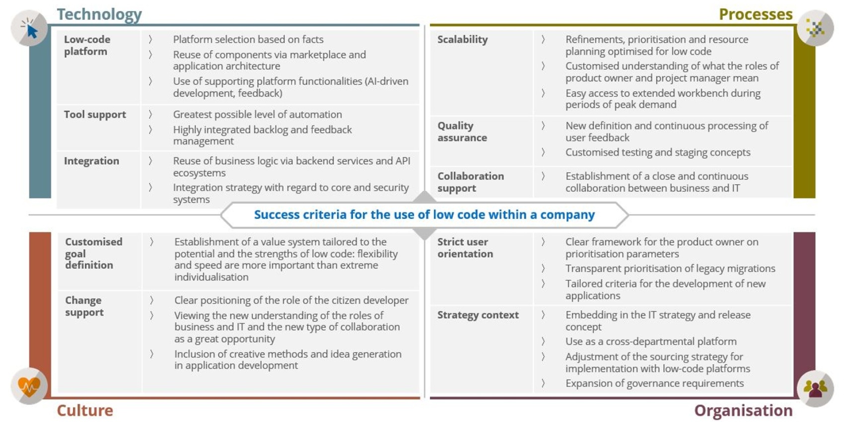 The spectrum of risks illustrates that an integrated approach is required for preparation and embedding low-code in a company. In the following illustration, the four areas of ‘Technology’, ‘Processes’, ‘Culture’ and ‘Organisation’ as well as the respective aspects are summarised that, in total, represent the success criteria for the use of low-code in a company.