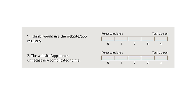 A questionnaire that surveys the perceived user-friendliness by means of ten statements. The user can choose from five ratings for each statement. The result of this questionnaire is the SUS score that is between 0 and 100. It should be 68 on average. Anything above this is considered positive.